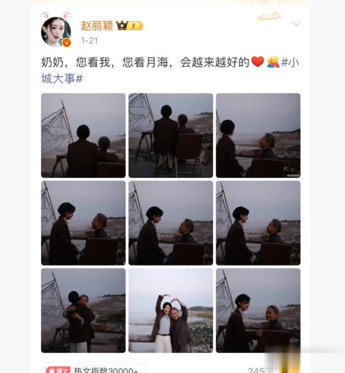 近日,赵女士在社交媒体上,更新了自己的新剧番外照片,照片中,她和“奶奶”坐在码头边看海。