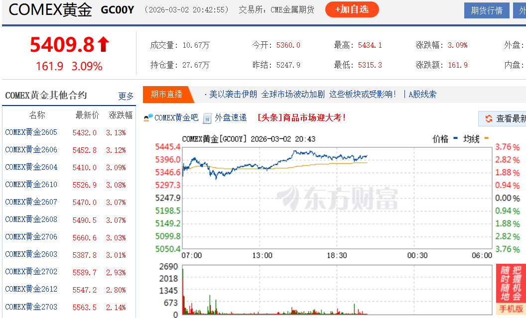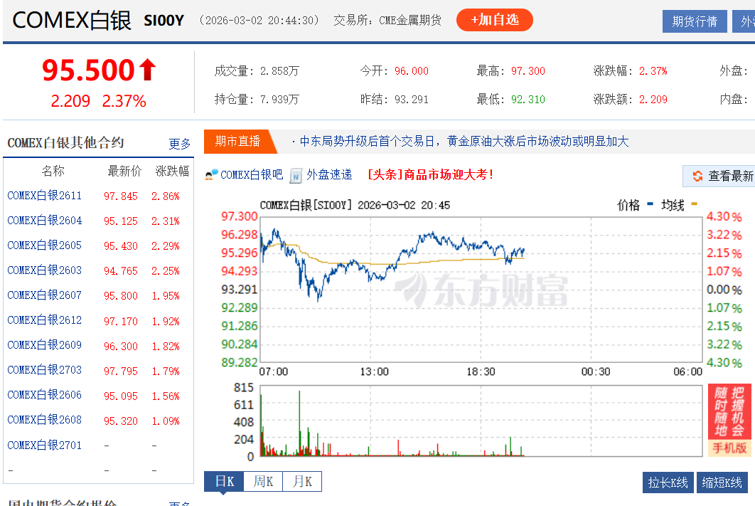 3月2日,现货黄金、白银价格双双震荡飙升,COMEX黄金站上5400美元/盎司,COMEX白银达95美元/盎司。