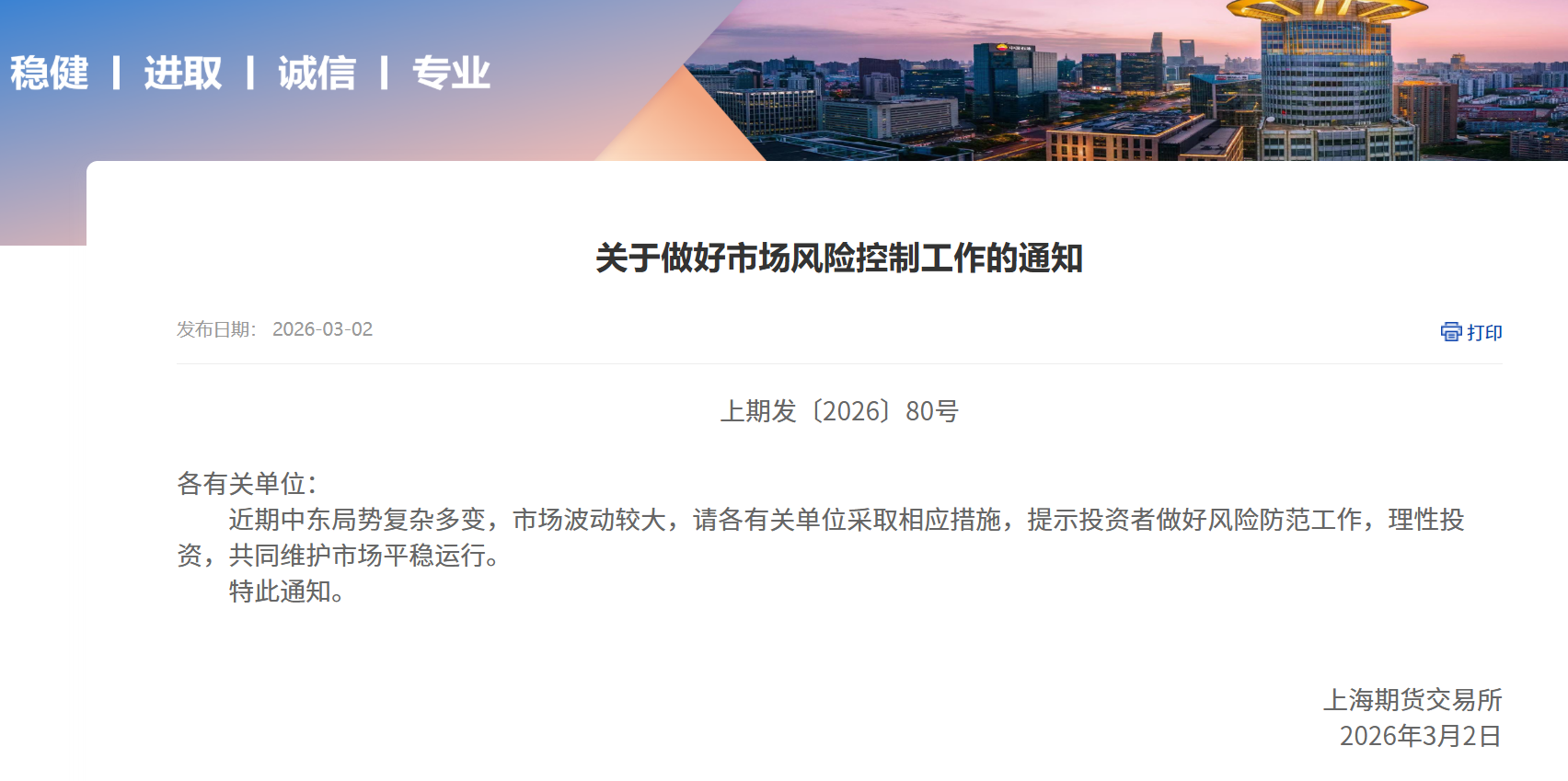上海期货交易所3月2日提醒,近期中东局势复杂多变,市场波动较大,请各有关单位采取相应措施,提示投资者做好风险防范工作,理性投资,共同维护市场平稳运行。