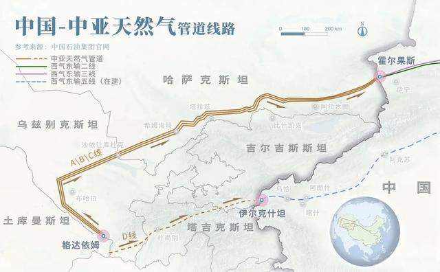 西北方向,中亚天然气管道是目前全球最长的跨国天然气管道之一,从里海东岸一直延伸到中国东部。