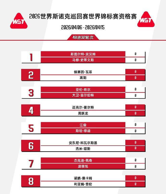 江俊 (78) 对 斯坦·穆迪 (44):这是一次00后之间的德比,以前两人在世界公开赛首轮相遇时,穆迪以5-4险胜,本场将是江俊复仇的重要机会。